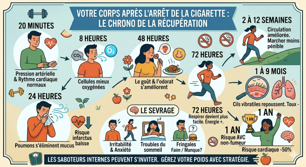 Arrêter la cigarette, c’est un peu comme lancer un bouton « Restaurer le système » sur votre corps. Dès que vous écrasez votre dernière cigarette, une réaction en chaîne impressionnante se met en marche. Voici la chronologie de ce qui se passe à l’intérieur :